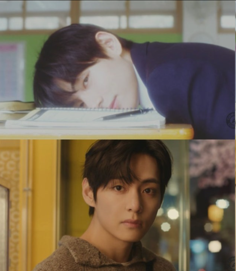 视频从 V 在咖啡馆点无咖啡因咖啡时,意外与初恋重逢的瞬间拉开序幕。随后,画面切换回了2019年3月的正值高中的青葱岁月,身穿校服的 V 帅气登场。